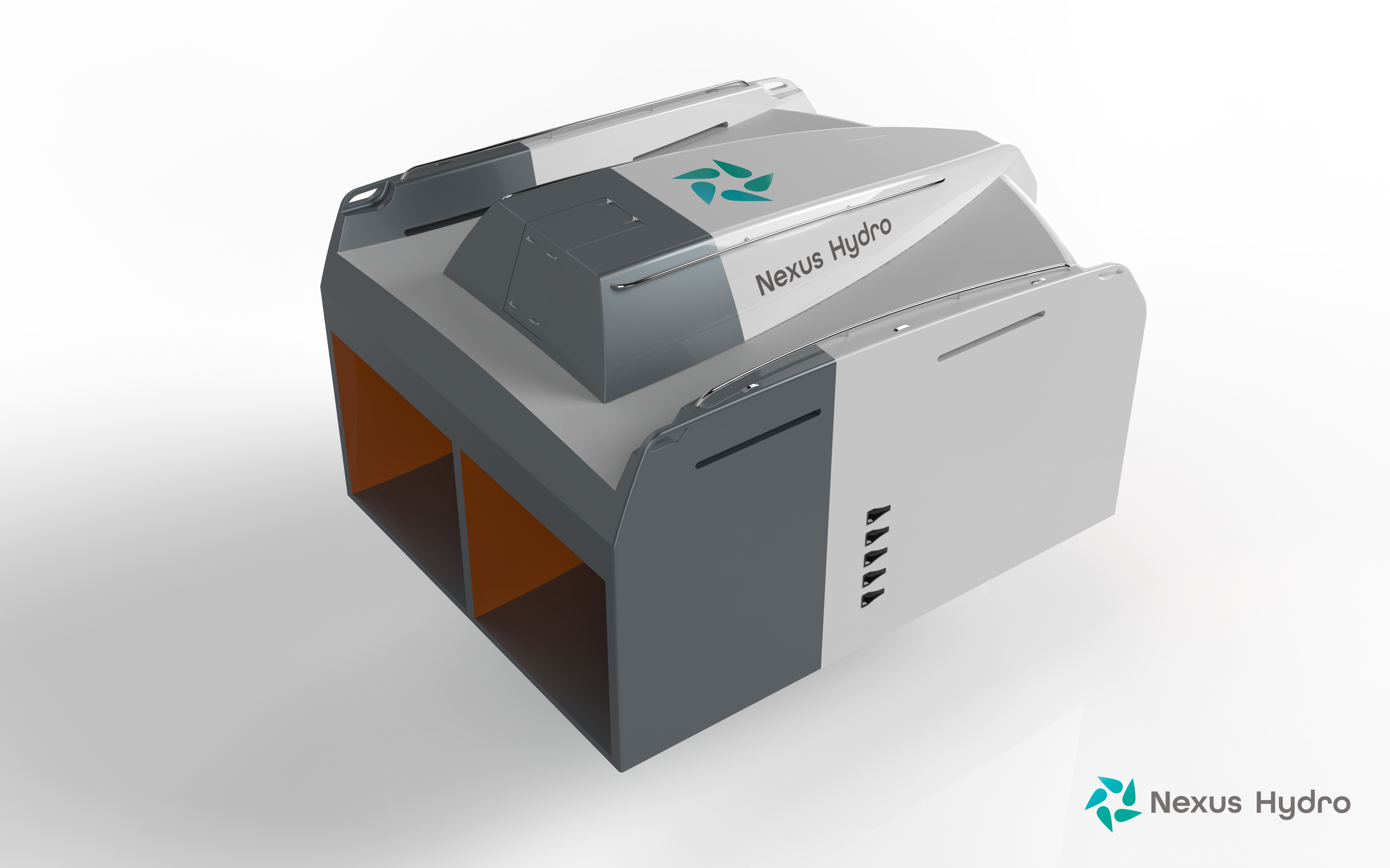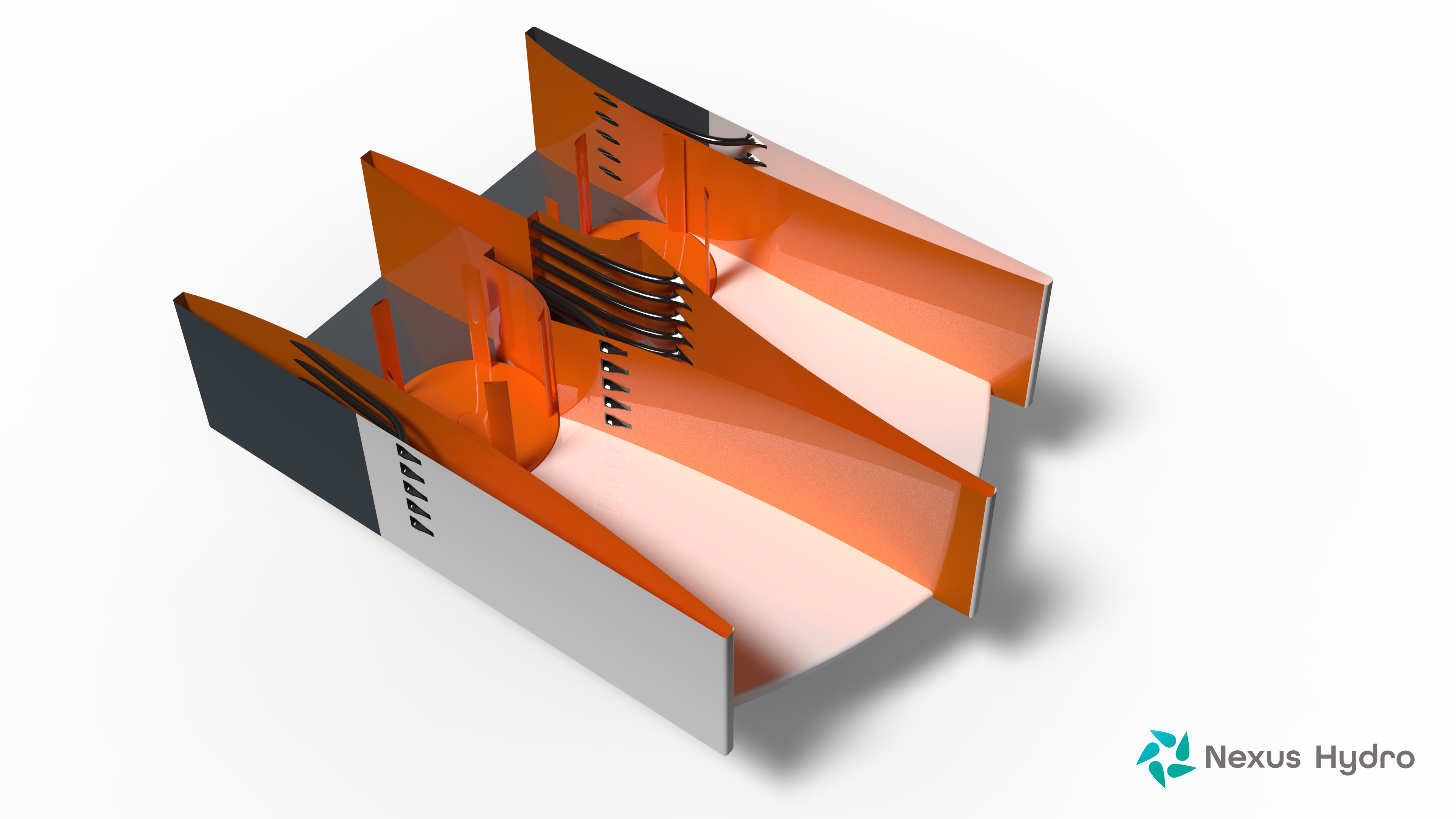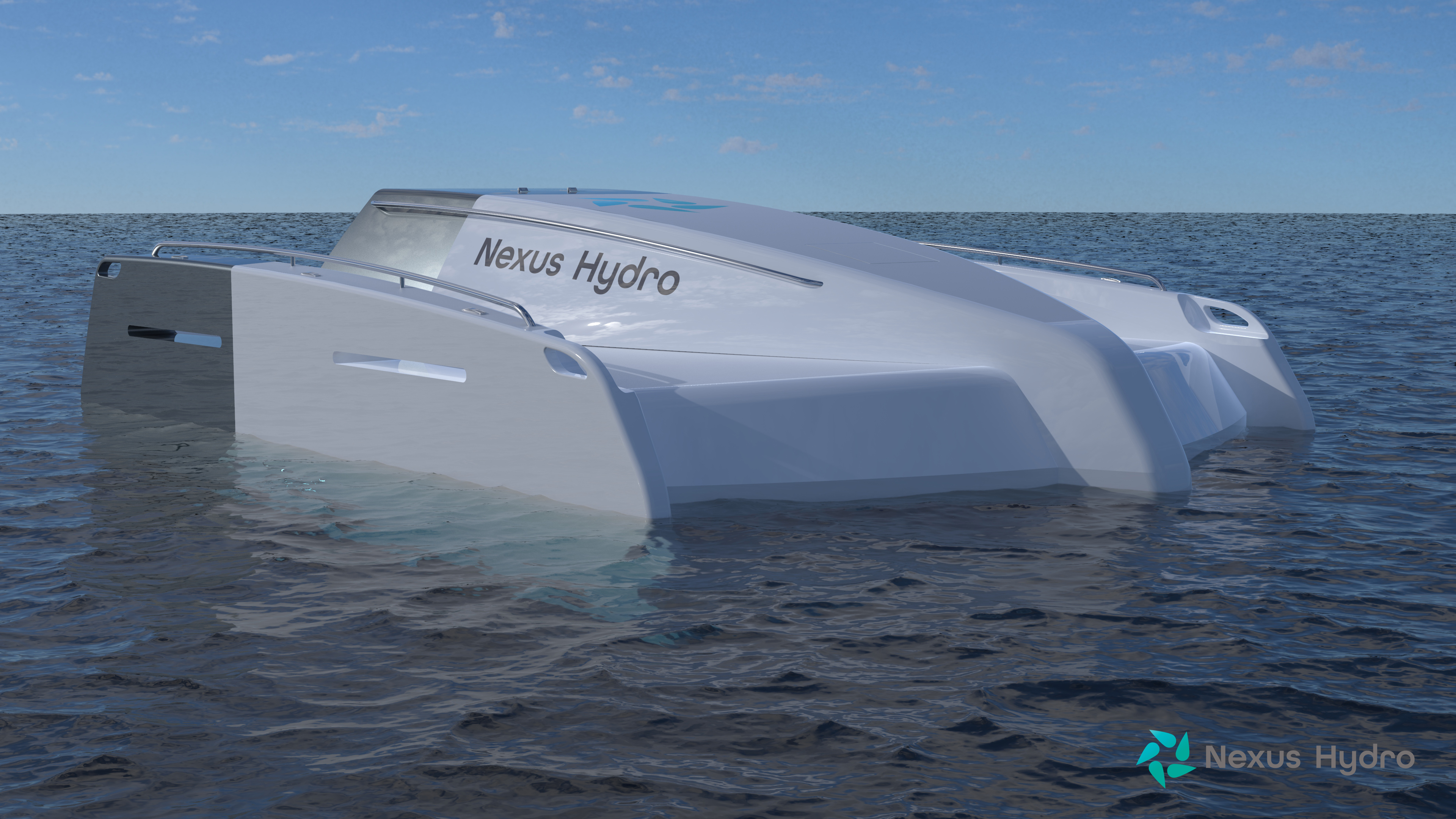 The NEXUS is an augmented turbine system. A trimaran hull houses two improved VAWTs (vertical axis water turbines); an augmenter system to increase the current velocity; and a special power generation system located above the waterline housing (placing it out of the water environment). The NEXUS Turbine will float like a barge on top of the sea, where the current is the strongest.