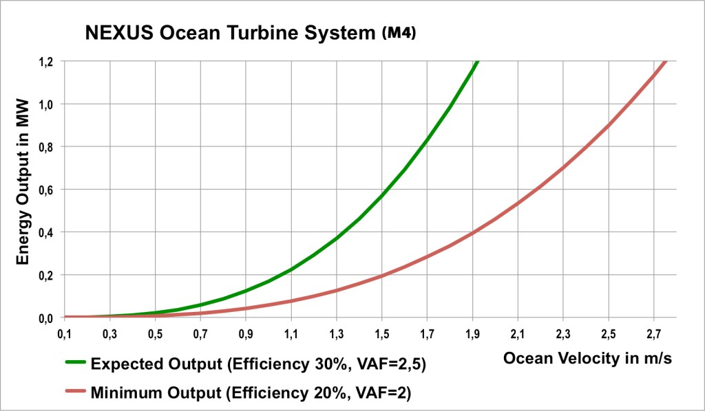 The combined bare turbine and augmentor extract the power used to drive the generator. The following charts show estimates of power generated for two levels of technology maturity: