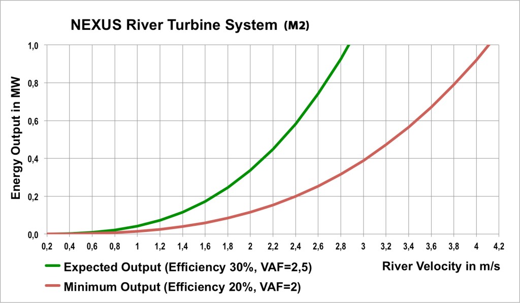 The red graph forecasts power generated using efficiency achieved in laboratory scale or pilot production tests. The green graph forecasts power generated by means of the system efficiency that we believe to achieve with our applied technology.
